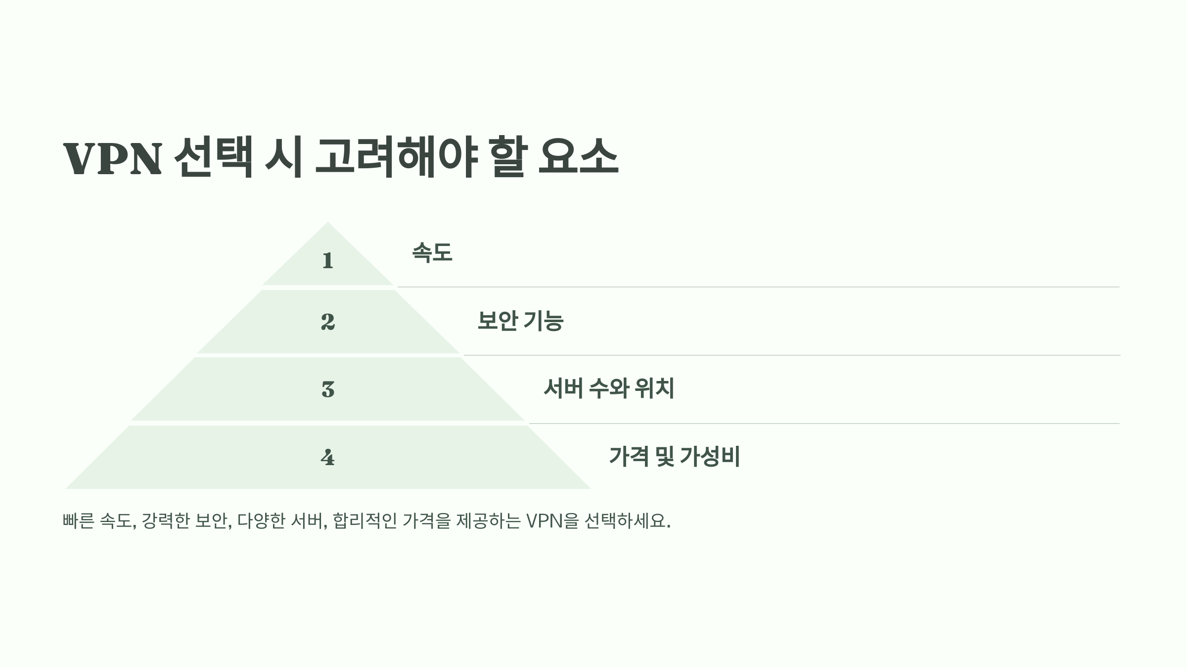 - 속도: VPN 사용 시 인터넷 속도가 저하될 수 있으므로 빠른 속도를 제공하는 서비스를 선택하세요.