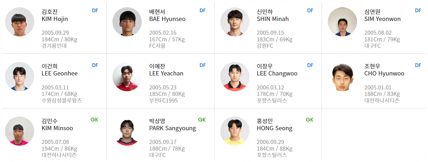 | 조현우 | DF | 2005.01.01 | 188cm / 83kg | 대전하나시티즌 |