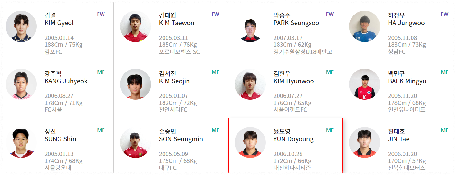 | 윤도영 | MF | 2006.10.28 | 172cm / 66kg | 대전하나시티즌 |
