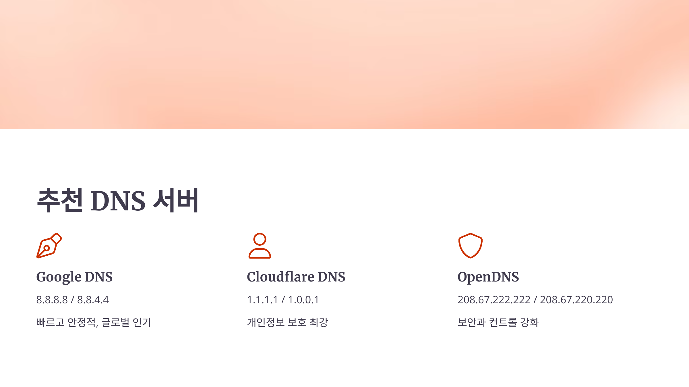 | Cloudflare DNS | 1.1.1.1 | 1.0.0.1 | 개인정보 보호 최강 |